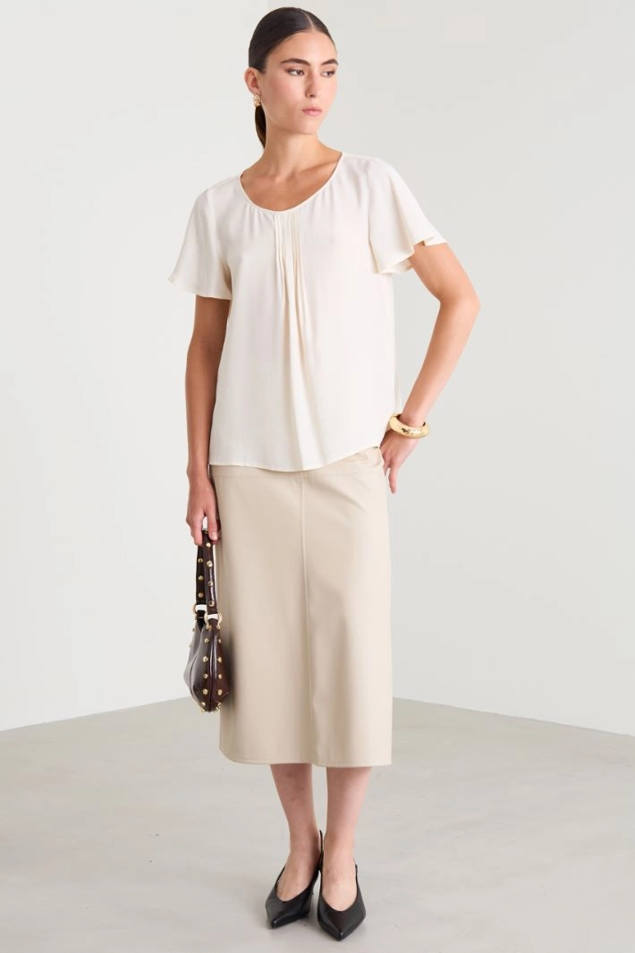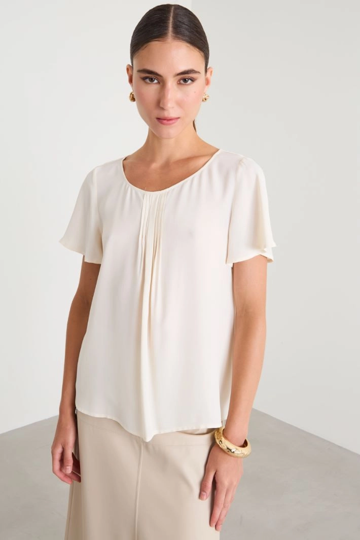 Flowing top in silk blend crepe de chine, with round neckline, short sleeves and stitched pleat motif.