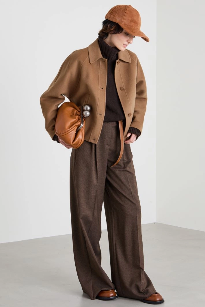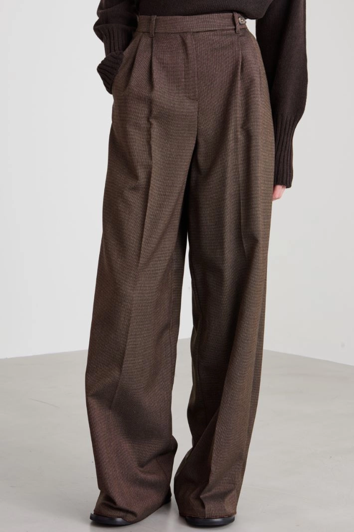 Straight-cut trousers in yarn-dyed viscose and wool fabric, with pleats, belt loops, French pockets in front, welt pockets in back and crease ironed lengthwise. Hidden fastening with zip and button