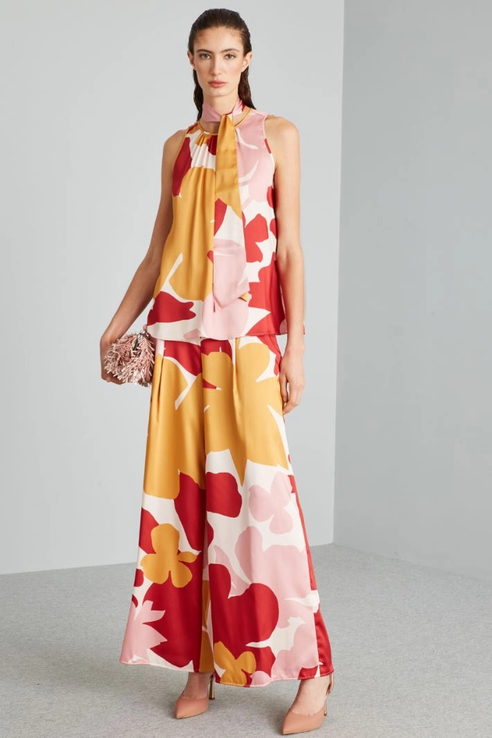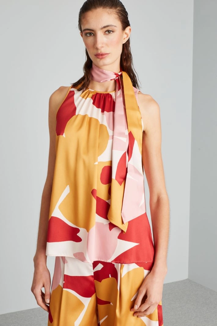 Flared sleeveless top in printed twill, with crew neck, thick straps, keyhole opening with button on the back. Matching scarf.