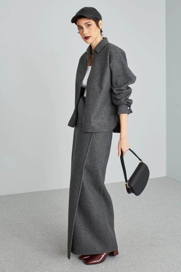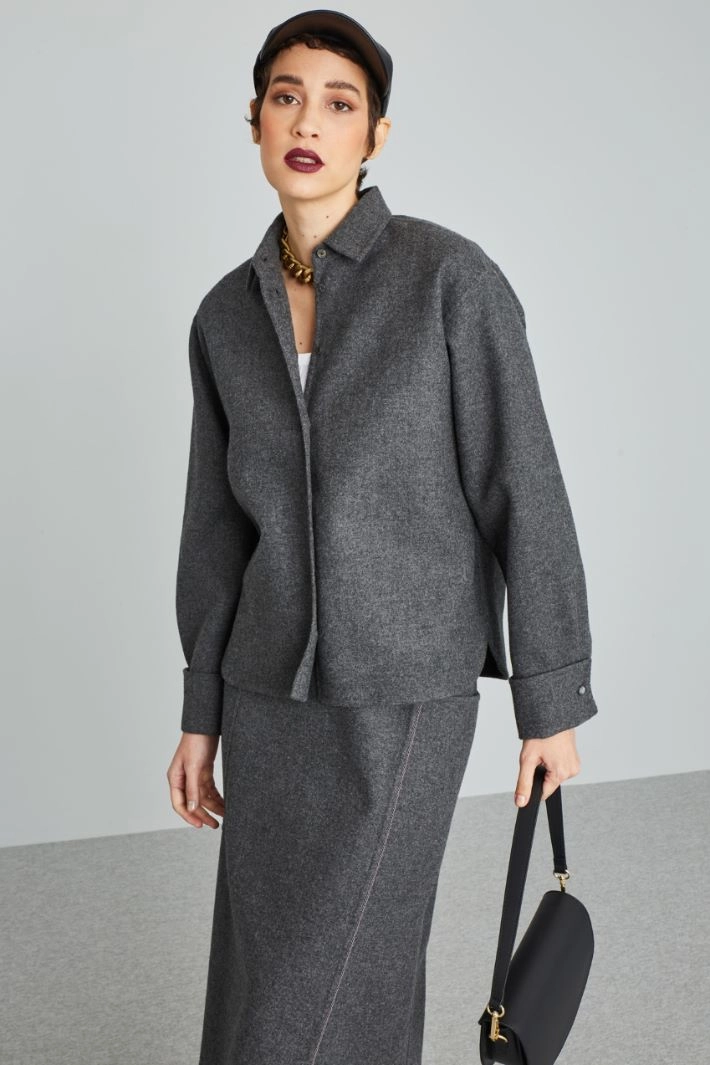 Shirt-style jacket in wool and cashmere double flannel with a classic pointed collar, long sleeves with cufflink cuffs and small rounded slits at the sides, yoke on the back. Visible button fastening.