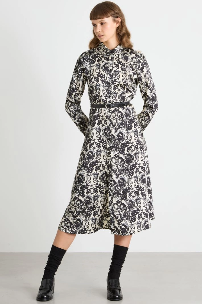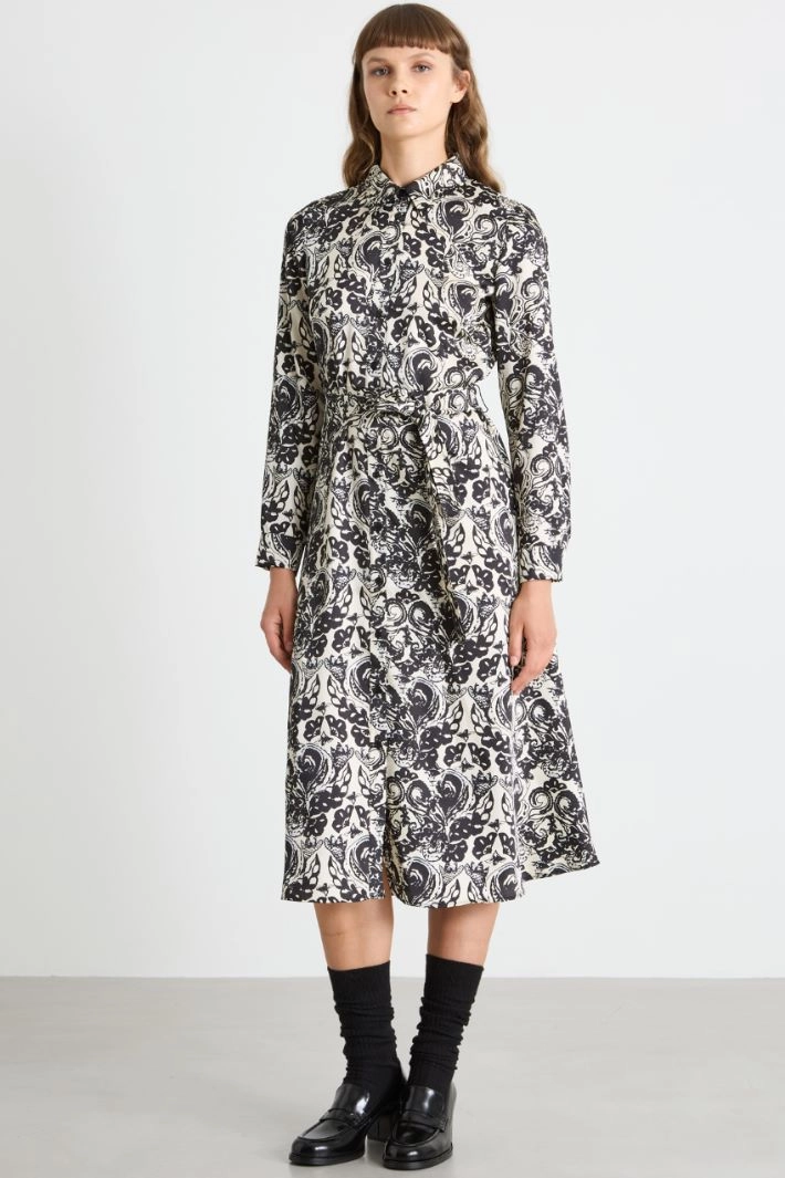 A-line shirt dress in all-over printed twill, with a classic collar, long sleeves with buttoned cuffs, and an elastic waistband at the back. Full-length button fastening. Matching sash.