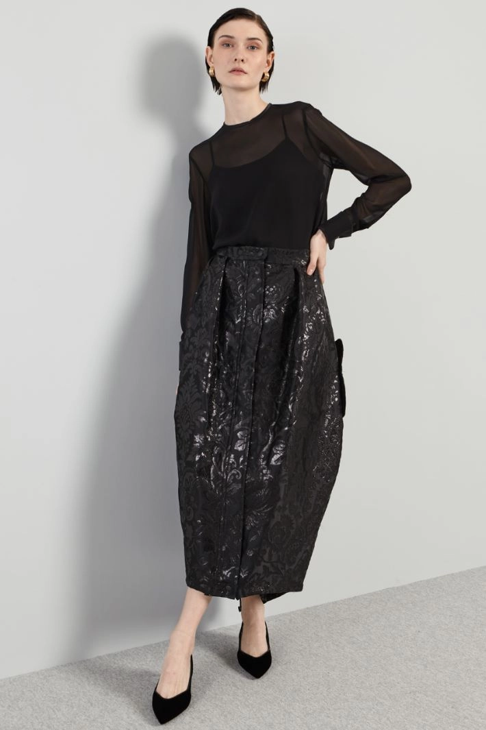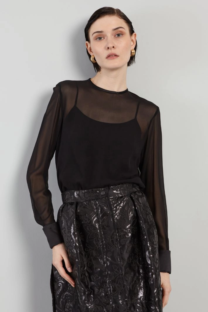 Fluid crew-neck blouse in pure silk georgette, with long sleeves finished with satin cuffs with cufflinks and keyhole fastening with button on the back. Matching slip top.