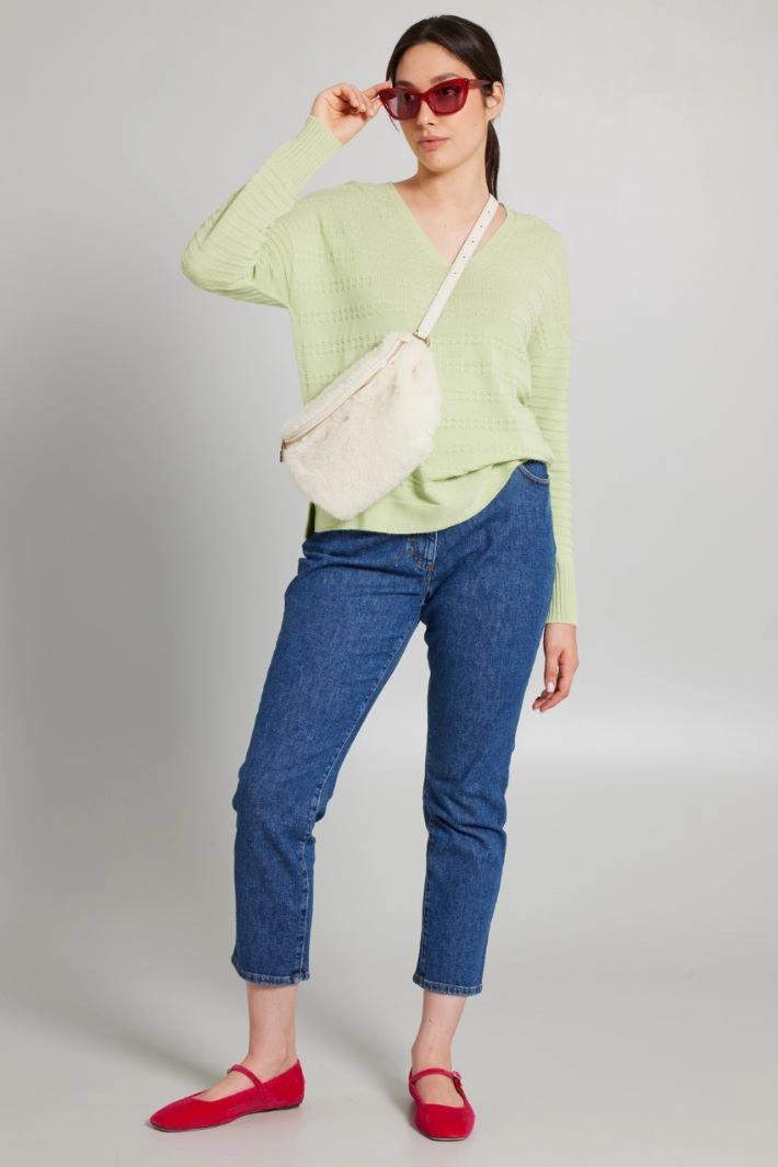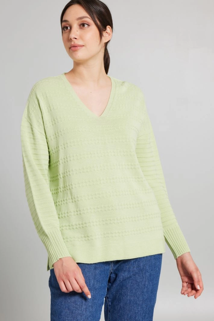 Regular-fit sweater in wool blend yarn, with raised pattern, V-neck, long sleeves and vents at the hem.
