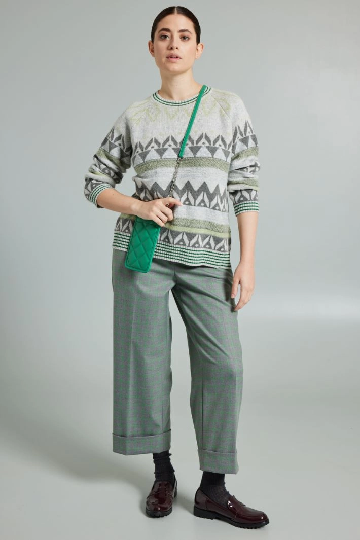 Regular-fit sweater in cotton, viscose and wool blend yarn, with jacquard motif, lamé fiber insert, crew neck, long sleeves and ribbed trims.