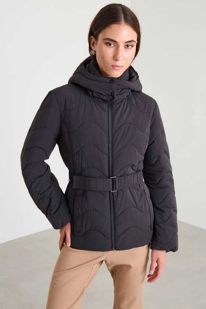 Regular-fit padded jacket in water-repellent technical fabric, with high collar and removable hood, long sleeves and zip pockets on the sides. Adjustable matching belt. Zip fastening.