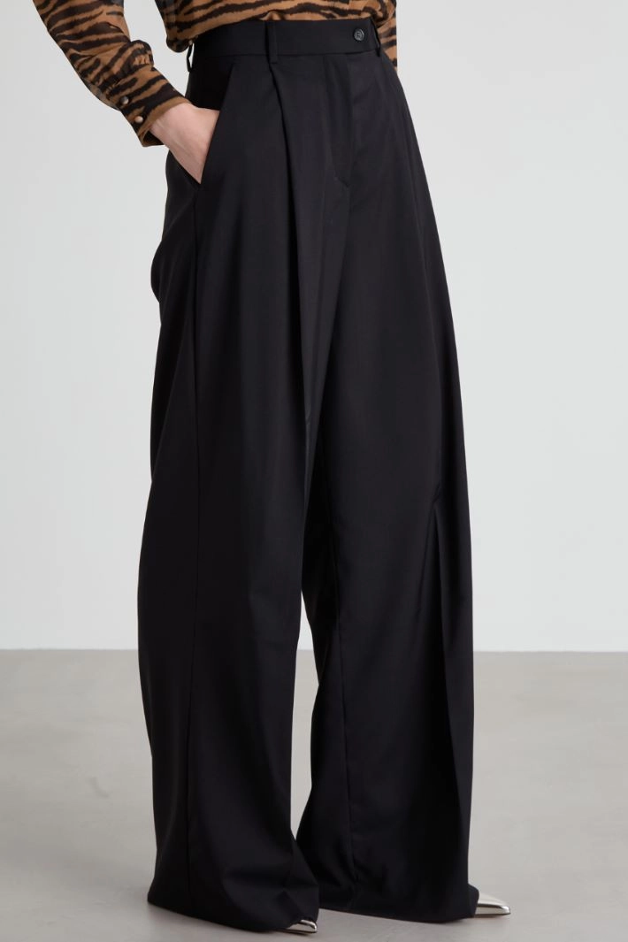 Men's trousers in pure wool canvas, with belt loops, darts sewn at the waist, side French pockets and welt pockets at the back and pressed crease lengthwise. Hidden fastening with zip and buttons.