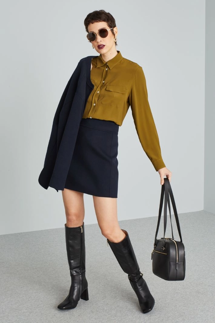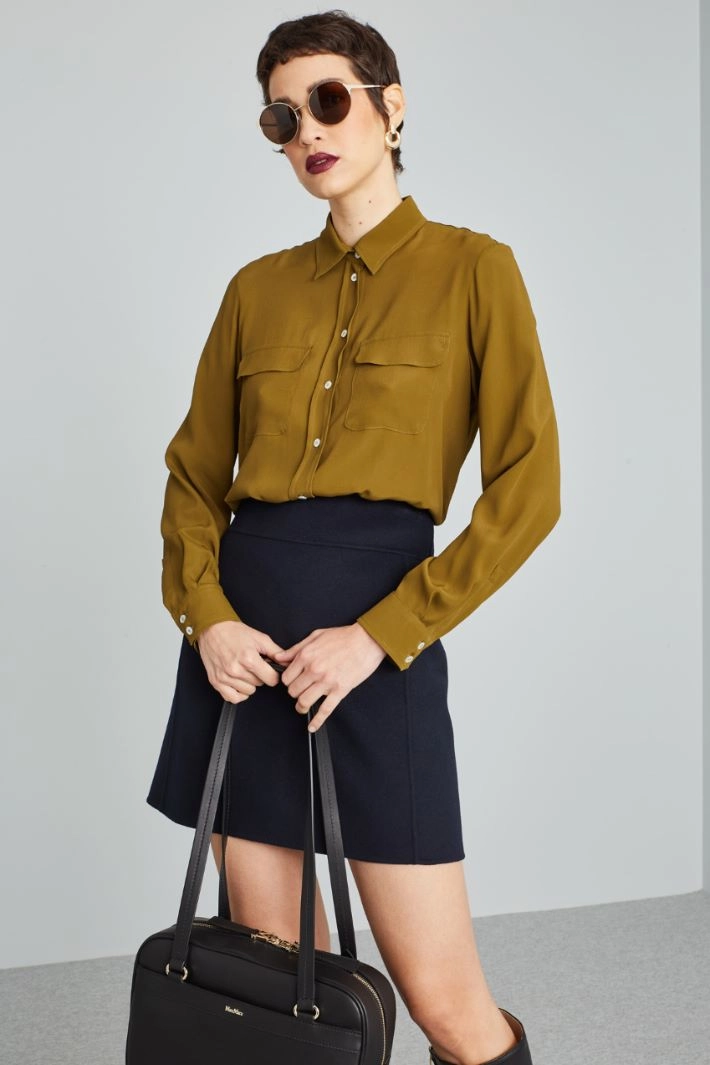 Fluid shirt in silk blend crepe de chine, with classic collar, long sleeves with cuff and buttons, patch pockets with flap on the chest and yoke cut with box pleat on the back. Button fastening.
