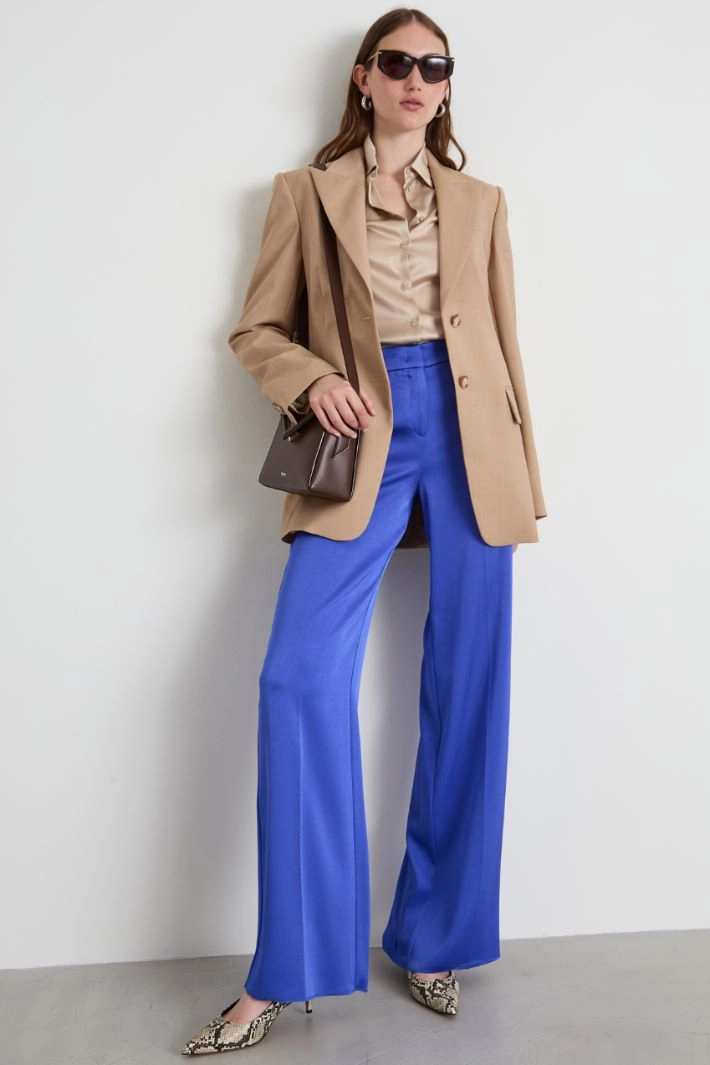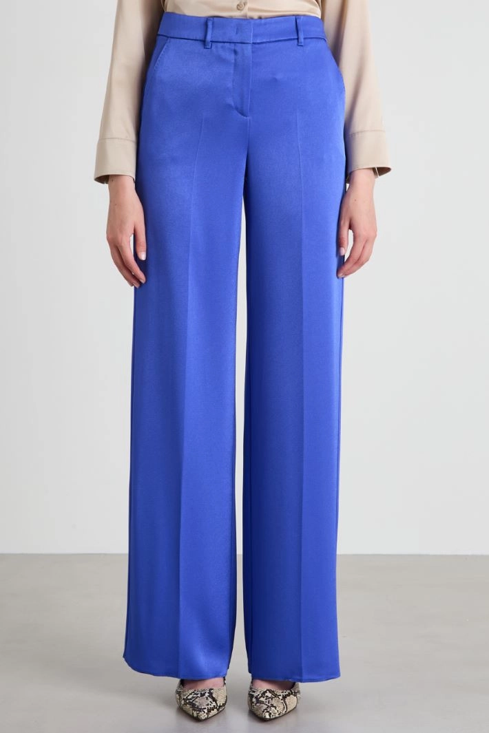 Straight-fit envers satin trousers with a shiny finish, belt loops at the waist, French pockets at the front and welt pockets at the back, and a crease pressed along the length. Concealed fastening with zip, button and hook.