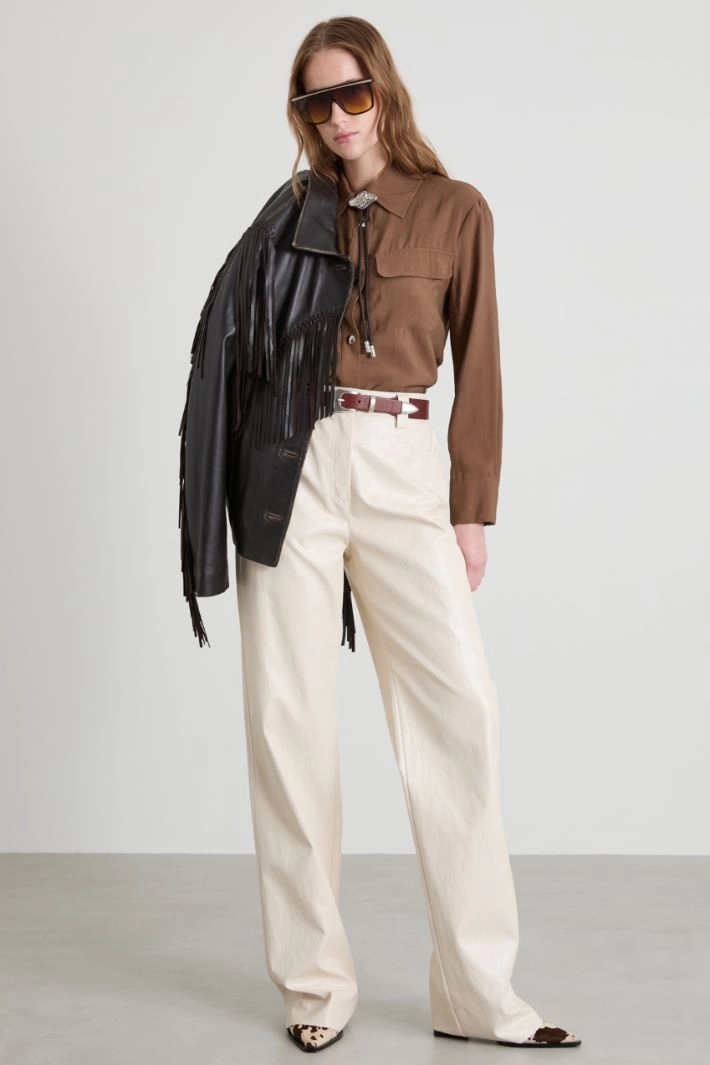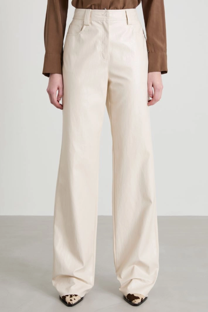 Straight-fit trousers in distressed faux leather, with belt loops and five pockets. Concealed fastening with zip, button and hook.