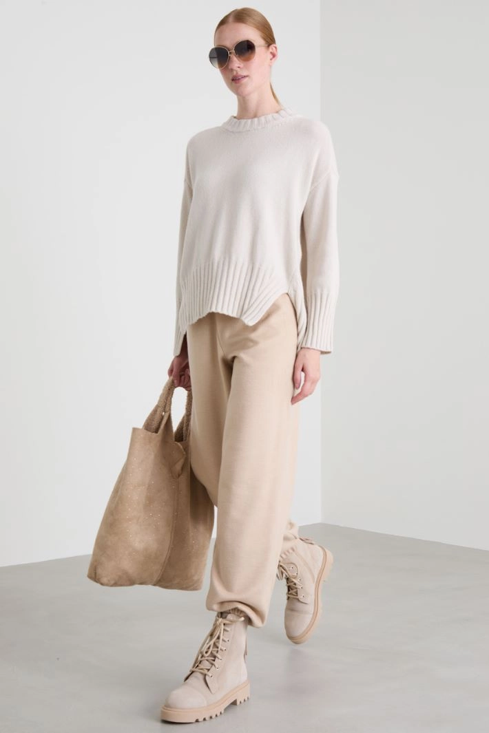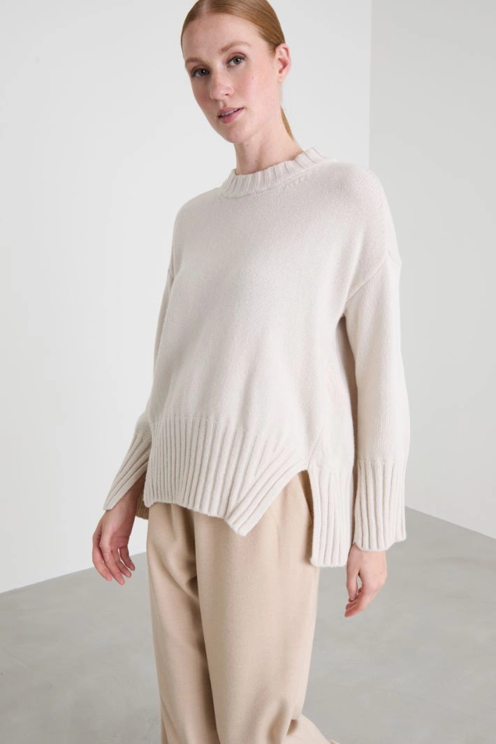 Loose-fitting sweater in wool, viscose and cashmere, with a crew neck, long dropped sleeves, side slits and ribbed trim.
