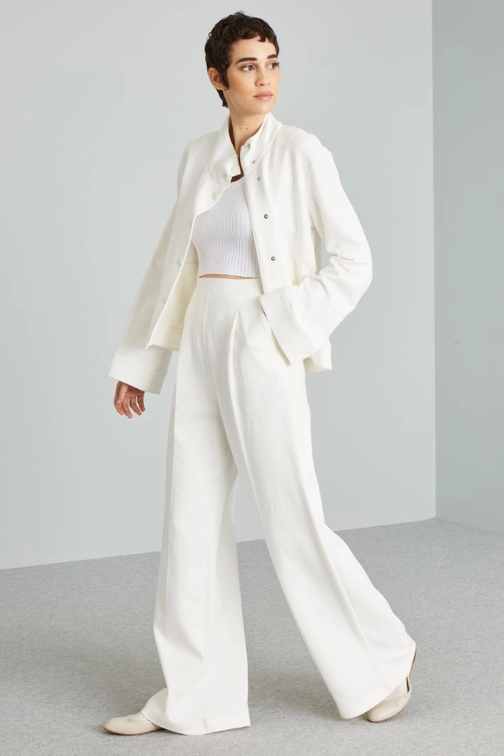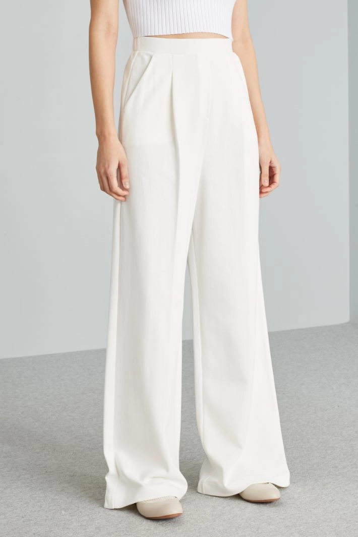 Wide-cut trousers in heavy cotton blend jersey, with elastic insert, sewn pleats at the waist and side French pockets.