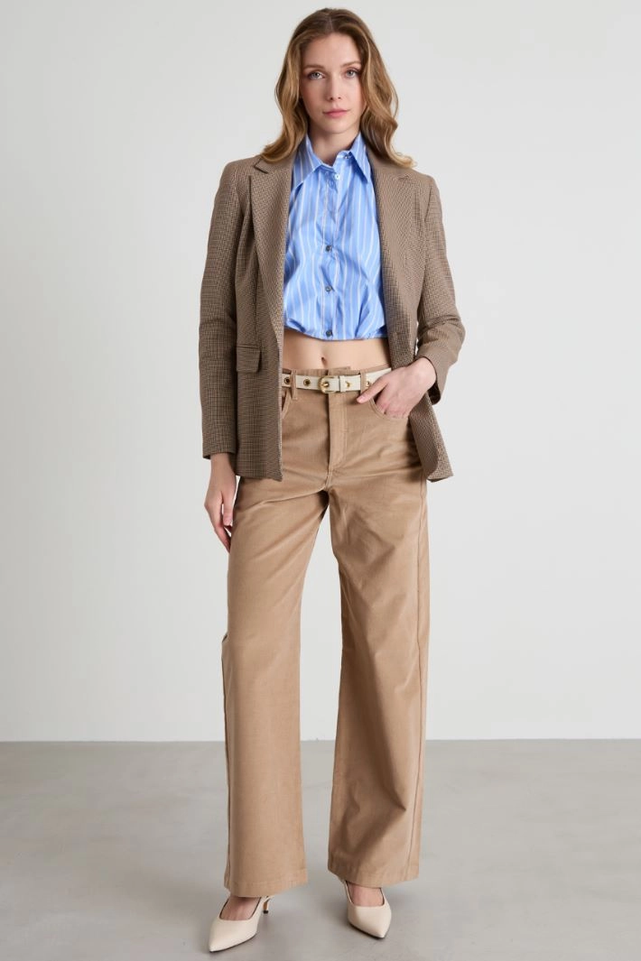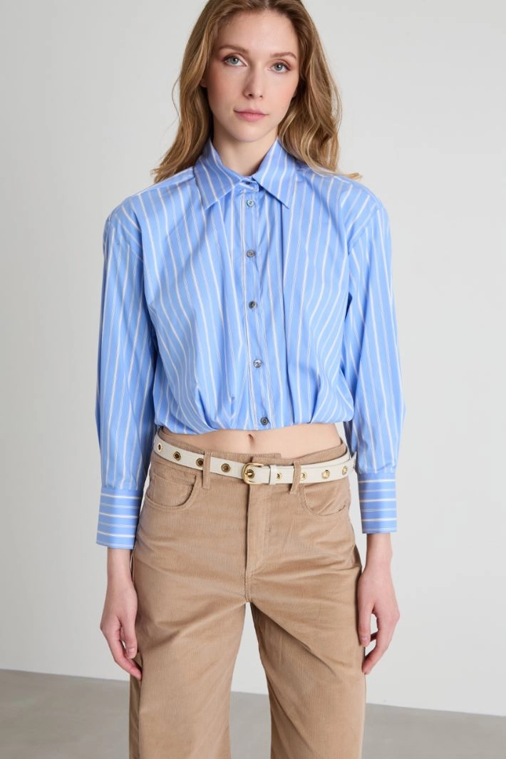 Regular-fit cropped shirt in stretch cotton-blend poplin, with classic collar, long sleeves with jewel button and hem. Button fastening. Semi-lined.