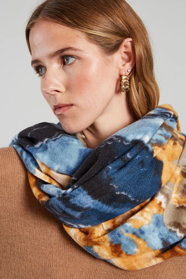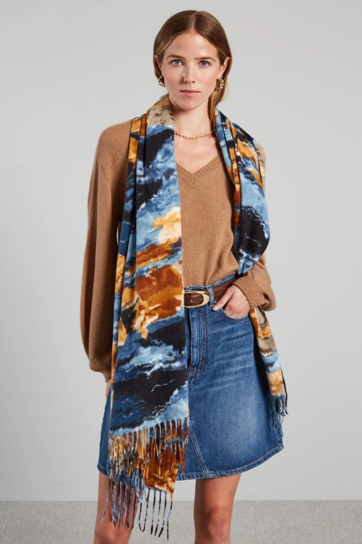 Scarf in light printed cloth, with fringe pattern at the bottom.
