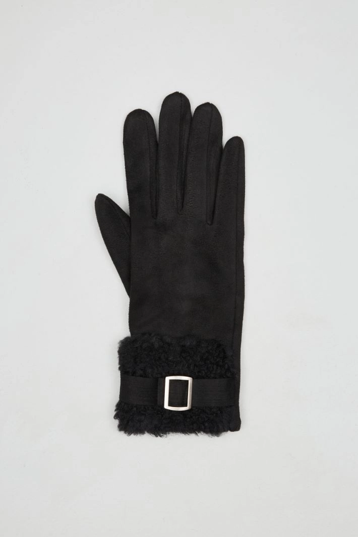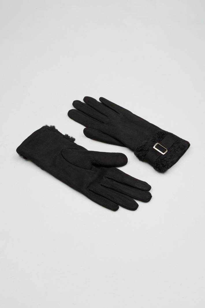 Gloves in suede-effect cotton blend jersey, with plush-effect fabric edge and decorative strap motif on the wrist. Plush interior.