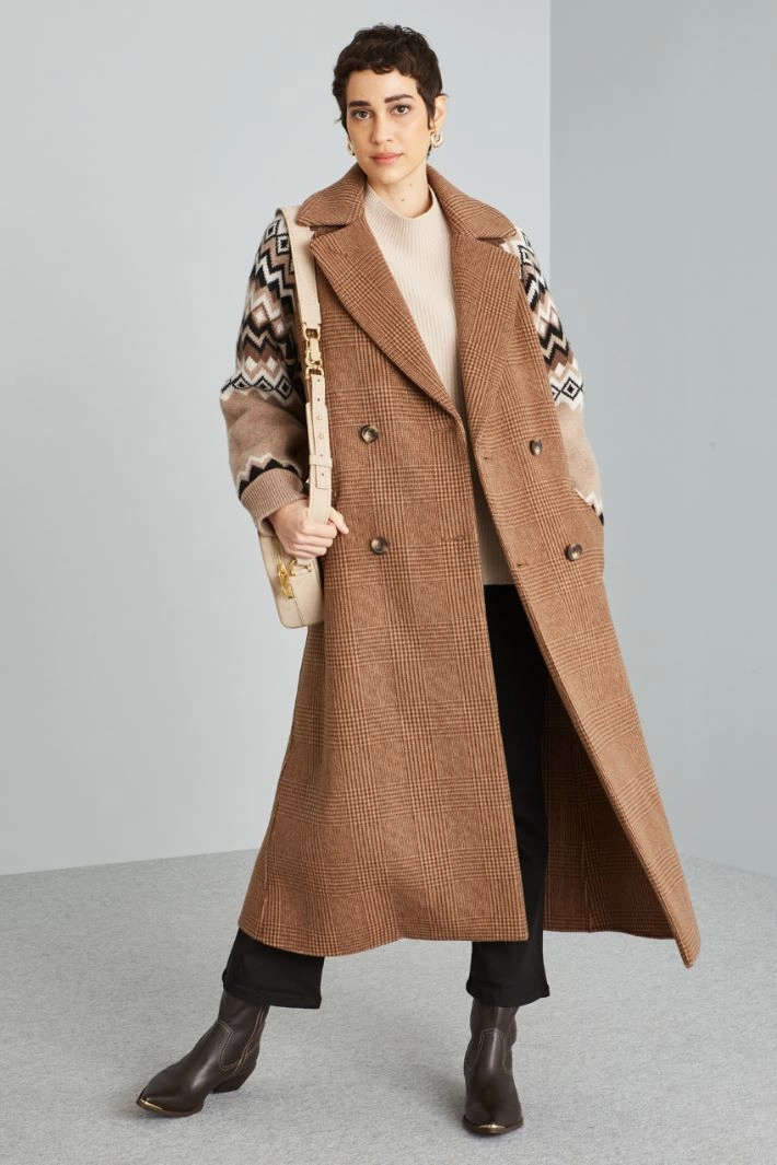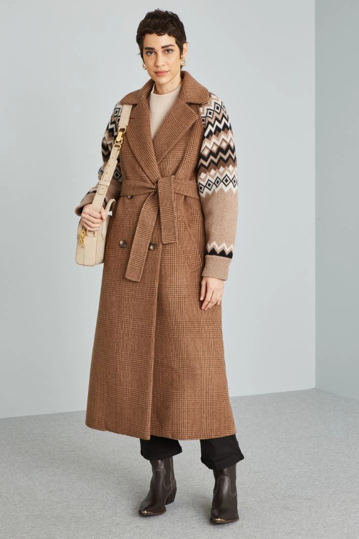 Long straight-cut coat in double drap of yarn-dyed pure wool, with knitted inserts, lapel collar, long raglan sleeves, slanted welt pockets and vent in the back. Double-breasted button fastening and matching belt. Unlined.
