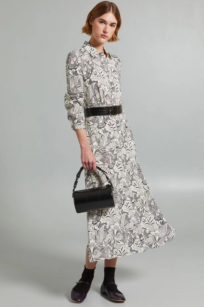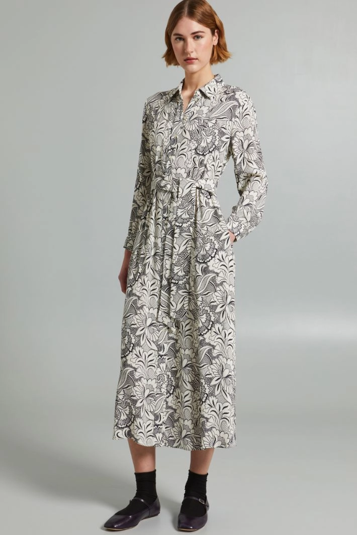 Shirt dress in all-over printed pure viscose crepe, with classic collar, long sleeves with cuff and button, inset side pockets and fastening with visible buttons on the front. Matching sash.