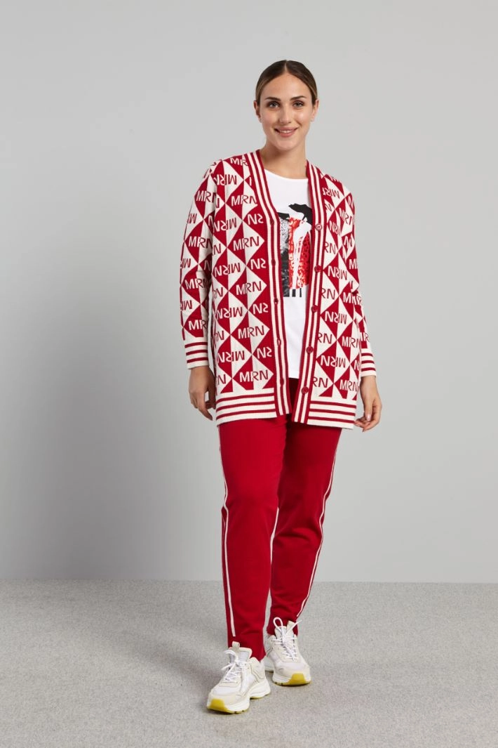 Straight-cut cardigan in jacquard viscose blend yarn, with V-neck, long sleeves and ribbed trims. Fastening with visible buttons and matching belt.