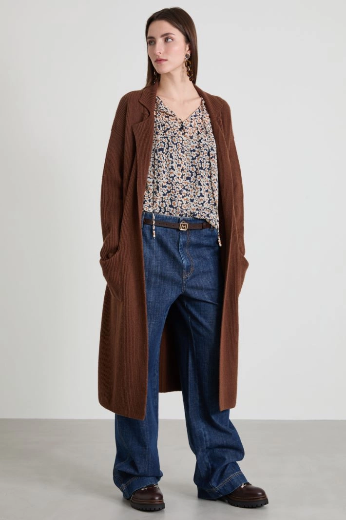 Long, loose-fit cardigan in pure wool yarn, with ribbed knit, lapel collar, long dropped sleeves, side patch pockets and matching belt fastening.