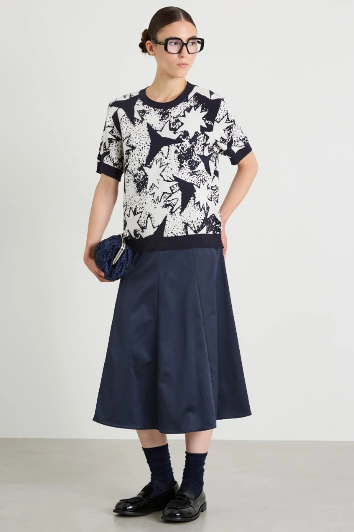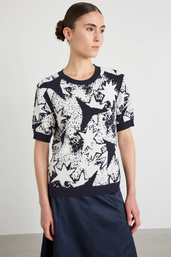 Straight-cut sweater in jacquard stretch viscose yarn, with round neckline, short sleeves and ribbed trim.