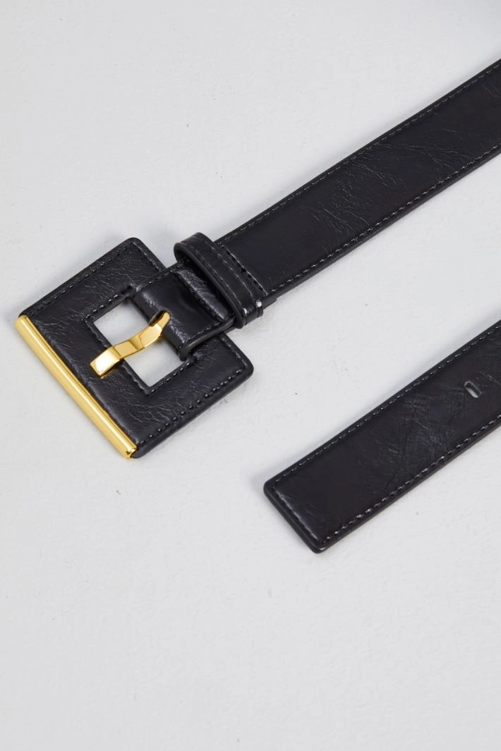 Belt in vintage-look glossy faux leather, with loop and closure with square buckle, pin and metal detail.