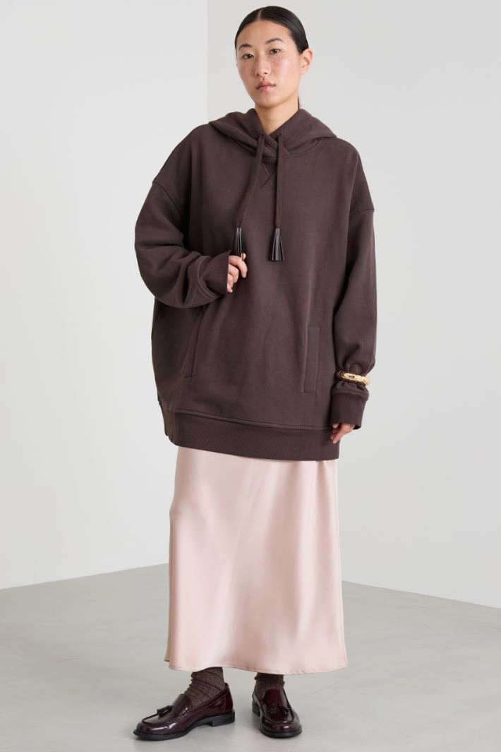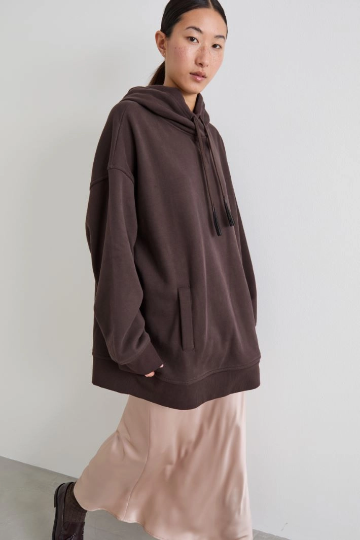Oversized sweatshirt in heavy pure cotton jersey, with drawstring hood, long dropped sleeves, side welt pockets and ribbed edges.