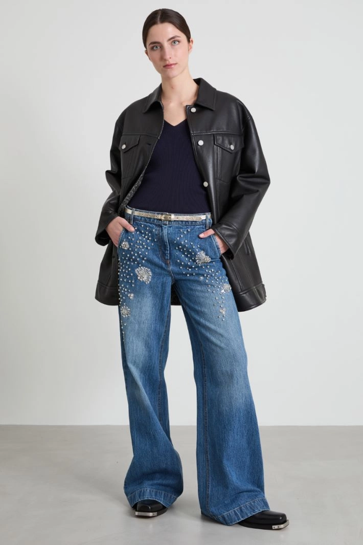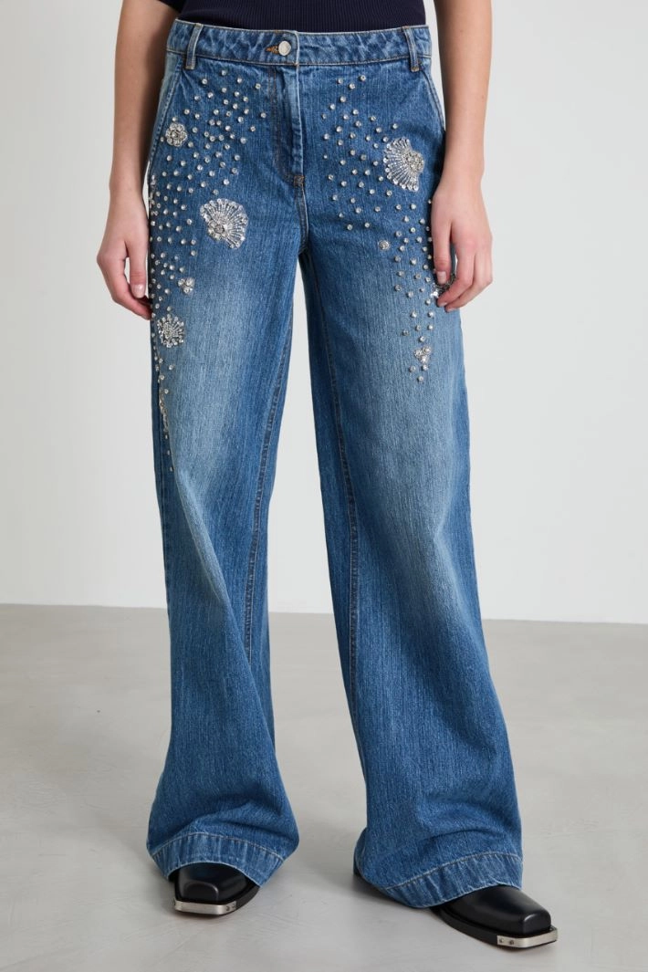 Straight and wide-leg jeans in pure cotton denim, with rhinestones and beads embroidered on the front, belt loops, French pockets on the front and patch pockets on the back. Fastening with hidden zip and button
