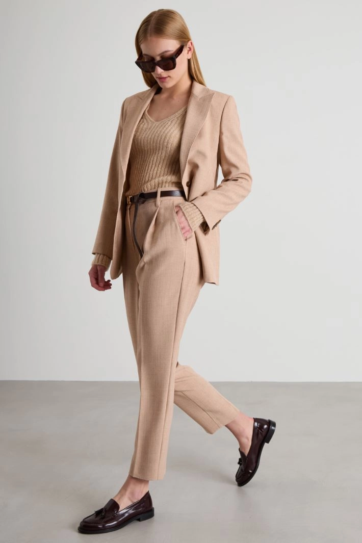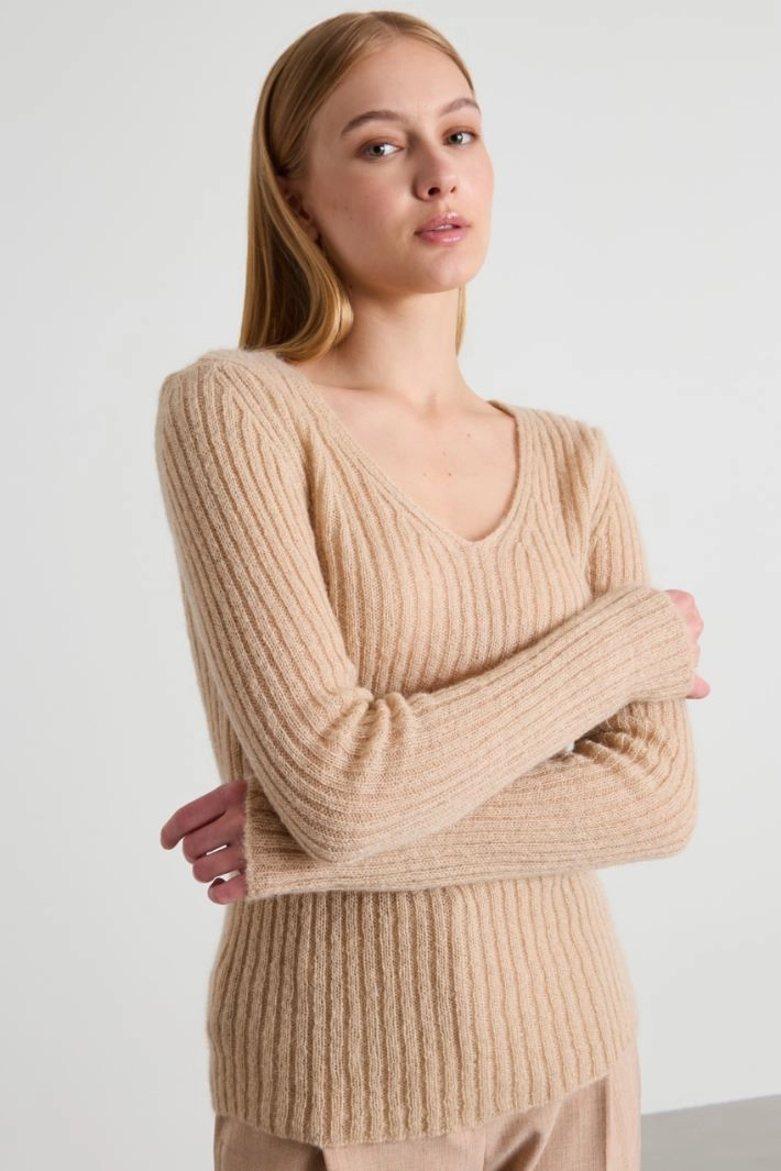 Slim-fit sweater in mohair blend yarn, with ribbed knit, a V-neckline to be worn on the front or back and long sleeves.