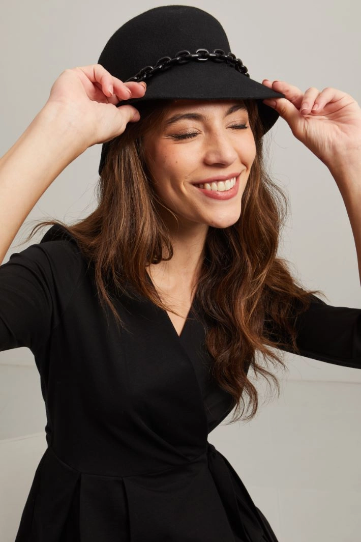 Cloche in pure wool felt, with matching chain detail and grosgrain ribbon.