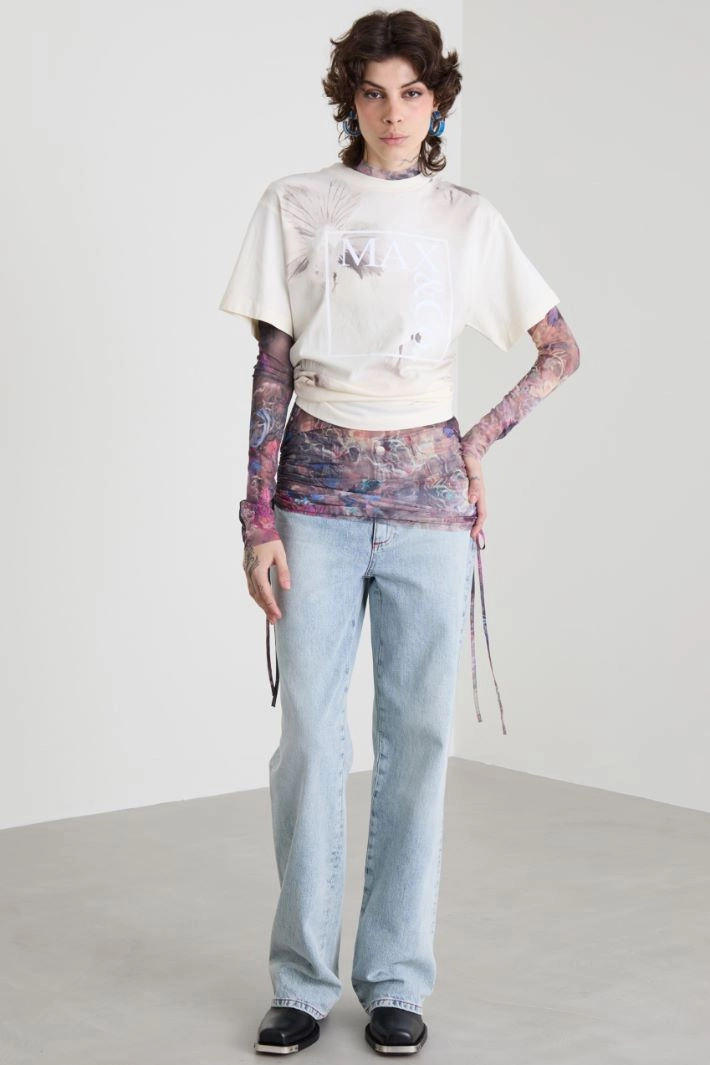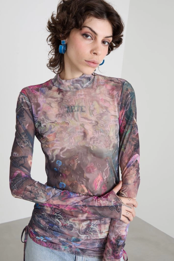 Fitted top in stretch tulle, with a high neck, long sleeves and a drawstring detail that creates drapes at the bottom.
