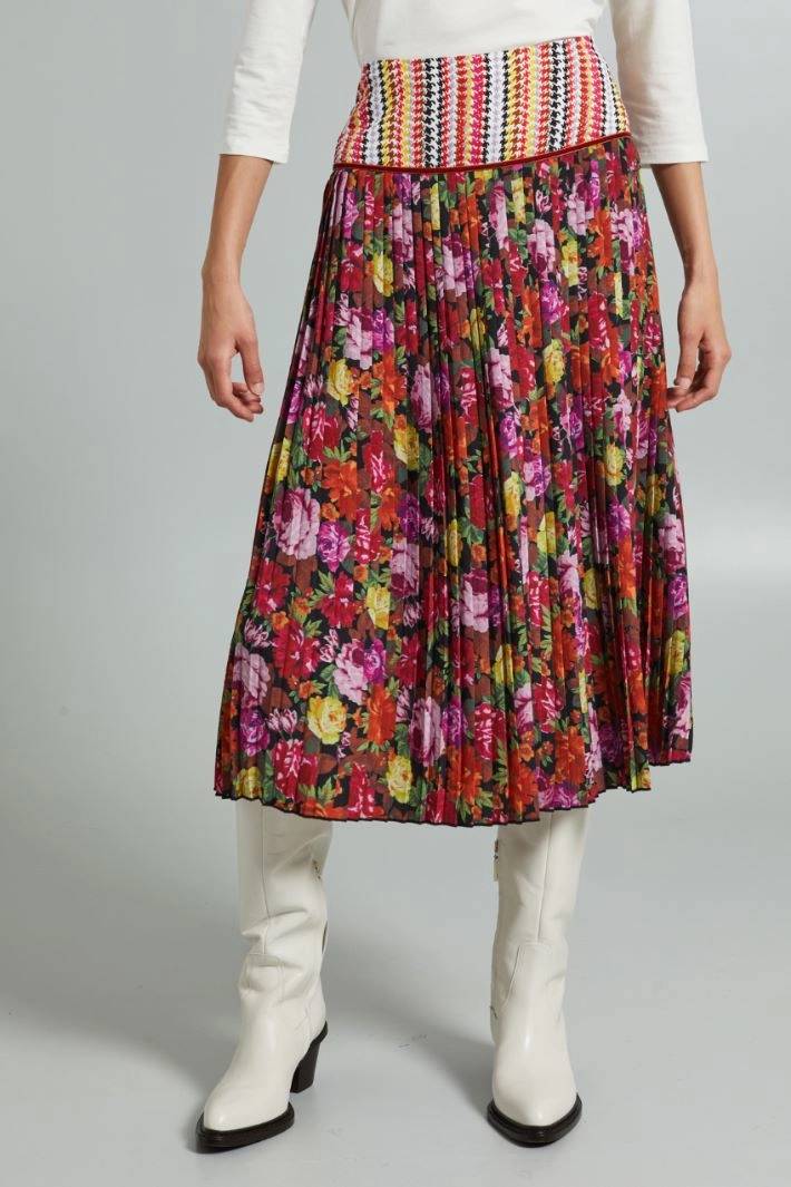 Flowing skirt in printed crepe de chine, with pleats, contrasting basque finished with velvet piping and invisible zip fastening on the back.