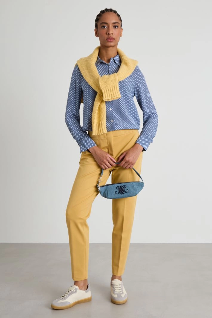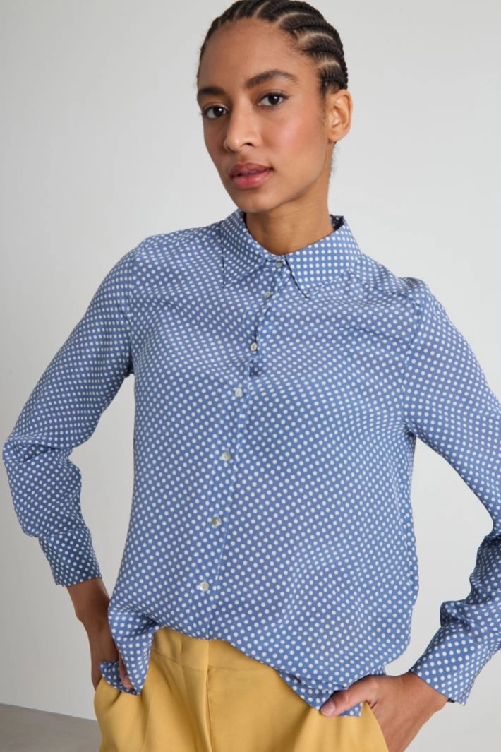 Flowing shirt in printed pure silk crepe de chine, with classic collar, long sleeves with cuff and button, and yoke cut at the back. Button fastening.