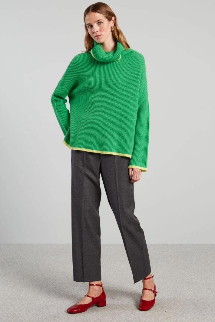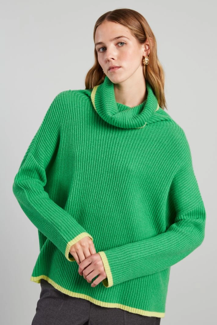 Loose-fit rib-knit sweater in pure cashmere yarn, with high collar with turn-up, long sleeves with dropped shoulders, side slits and contrasting finished profiles.