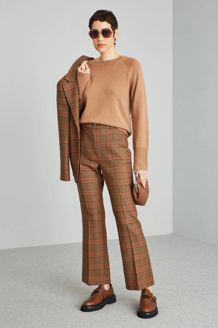 Flared trousers in pure yarn-dyed wool batavia, with belt loops at the waist, French pockets at the front and welt pockets with button at the back. Hidden fastening with zip, button and hook.