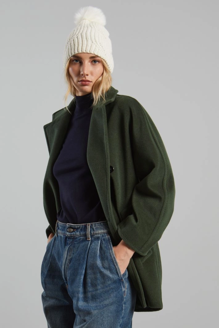 Beanie hat in wool, alpaca and viscose blend yarn with pom pom on top.