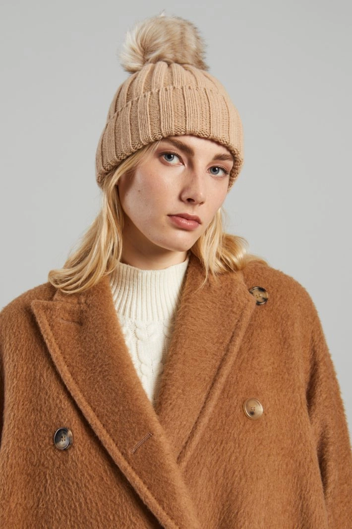 Beanie hat in wool, viscose and cashmere blend yarn, with ribbing, pom pom at the top and turned-up edge.