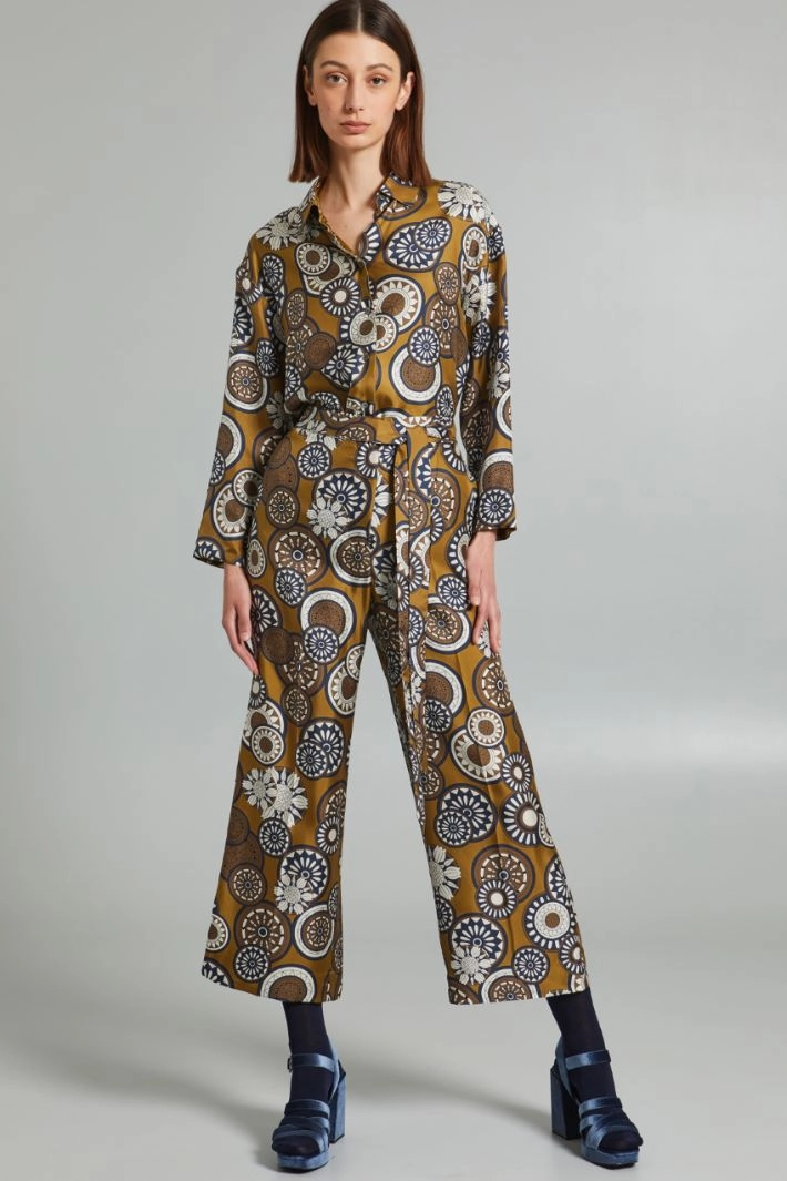 Fluid trousers in printed pure silk twill, with elastic insert at the waist on the back, inset side pockets and hidden fastening with zip, button and hooks. Matching sash.