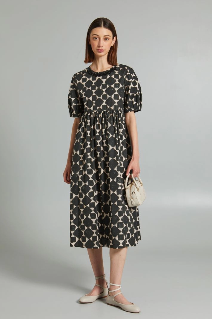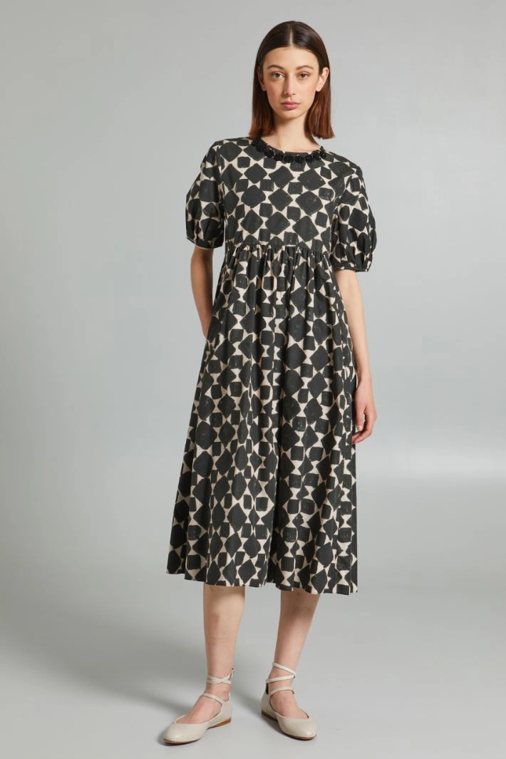 Crew-neck dress in printed pure cotton poplin, with neckline finished with removable rhinestones, short balloon sleeves and gathered cut under the bust. Flared skirt with inset side pockets. Invisible zip fastening on the back.